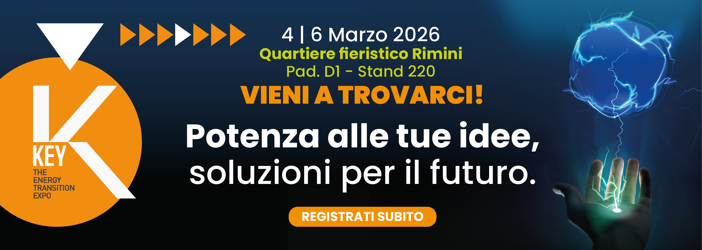 ATTENZIONE: l'email che riceverete alla fine della compilazione del form sottostante NON VALE COME BIGLIETTO, ma dovrete registrarvi con la stessa email nel sito del Key Energy (key-expo.com/it/reserved-area/), all'interno della quale potete scaricare i biglietti che sono NOMINATIVI (dunque varranno solo per il partecipante proprietario dell'email) solo dopo ricevuto l'avviso dell'arrivo del biglietto. Qualora, ad esempio, vorrete partecipare alla fiera in un gruppo di più persone, ognuno si deve registrare con la propria email (sia nel form sottostante, sia nel sito del Key Energy).