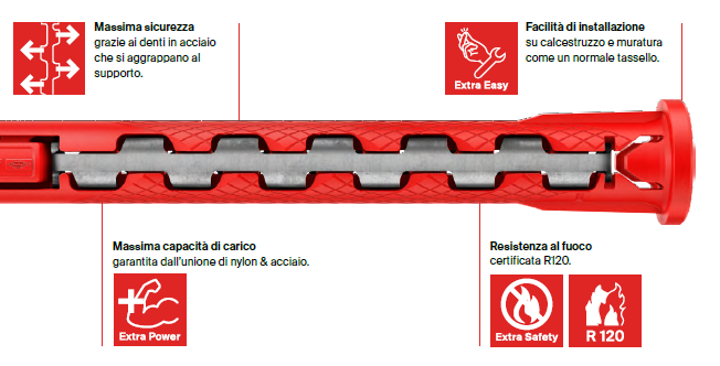 - SICUREZZA: Denti in acciaio per una tenuta estrema.Resistenza al fuoco certificata R120. Carichi fino a 4,62 kN su calcestruzzo C20/25