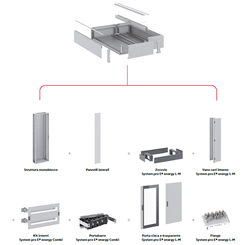 Il sistema System pro E® energy Combi completa il System pro E® energy M ed è costituito da kit funzionali e accessori comuni che consentono il montaggio delle varie apparecchiature modulari e scatolate come la serie Tmax T5 e T6, Tmax XT da XT1 a XT6 in versione fissa per installazione verticale e orizzontale con attacchi anteriori.