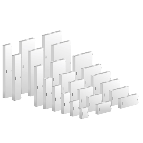 Al loro interno sono già provvisti di profili per il fissaggio di kit interni portabarre e di un telaio per il montaggio di pannelli frontali. Sono affiancabili lateralmente ad altre strutture fino ad un massimo di 3 colonne.