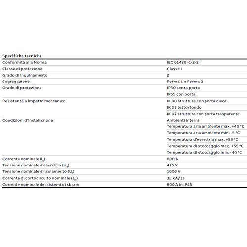 La gamma si compone di Strutture fornite in versione monoblocco per realizzazioni a parete e pavimento con grado di protezione IP30 (senza porta) e IP55 (con porta) ed è in grado di coprire applicazioni per quadri di distribuzione secondaria fino a 800A.