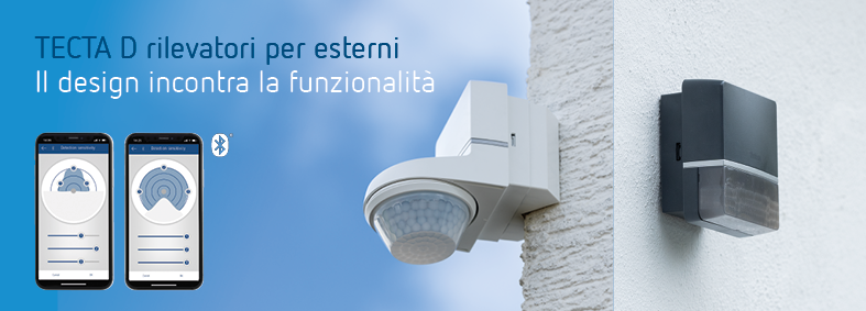 Con la nuova serie TECTA, Theben offre un portafoglio completo di rilevatori da esterno: dal D180 per installazioni semplici e veloci, fino ai modelli "i" per progetti più avanzati, dove precisione, versatilità e controllo digitale fanno la differenza.